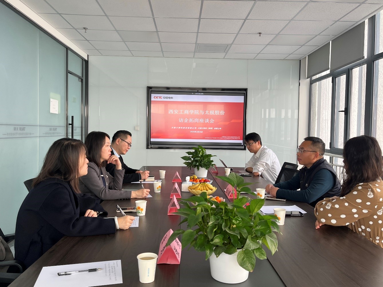 在太极计算机股份有限公司,张小斌总经理详细介绍了太极股份作为国内电子政务、智慧城市和关键行业信息化的领军企业在数字政府、数字企业、数字国防等业务上的发展情况。张雪鹏院长介绍了西安工商学院经济与管理学院的人才培养、专业建设、产教融合等详细情况,并表示希望通过走访的方式了解社会、企业最需要的人才,根据实际情况,建立起人才培养和人才输送的长效机制。