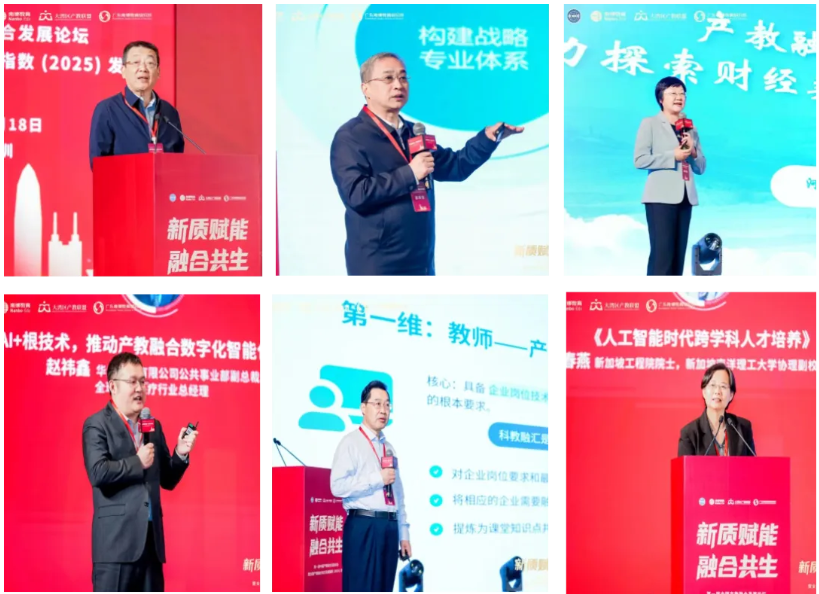 下午分论坛主题演讲环节,商务部原党组成员蒋耀平、中国市场学会会长夏杰长、榆林学院原党委书记张新柱、深圳大学粤港澳大湾区新兴产业发展研究院院长龚晓峰、大湾区产教联盟理事长陈标新教授等多位来自政府部门、行业组织、高校及企业的代表,围绕跨境电商发展、金融工程人才培养、区域高校赋能、企业主体作用发挥等方向展开分享。演讲一致强调,应通过体制机制创新、平台共建与资源整合,强化“政产学研用”协同,切实推动教育供给与产业需求精准对接,构建开放融合、持续发展的育人生态。最后的两场圆桌对话分别以“人工智能赋能产教融合的路径探索”和“产教融合的现实堵点与破解之策”为主题,汇聚多方专家展开深度对话。讨论指出,AI技术是重构产教融合形态的关键变量,能够促进资源高效配置;同时,必须通过制度设计优化与利益共同体构建,破解“校热企冷”等深层矛盾,真正实现风险共担、利益共享的协同治理新格局。